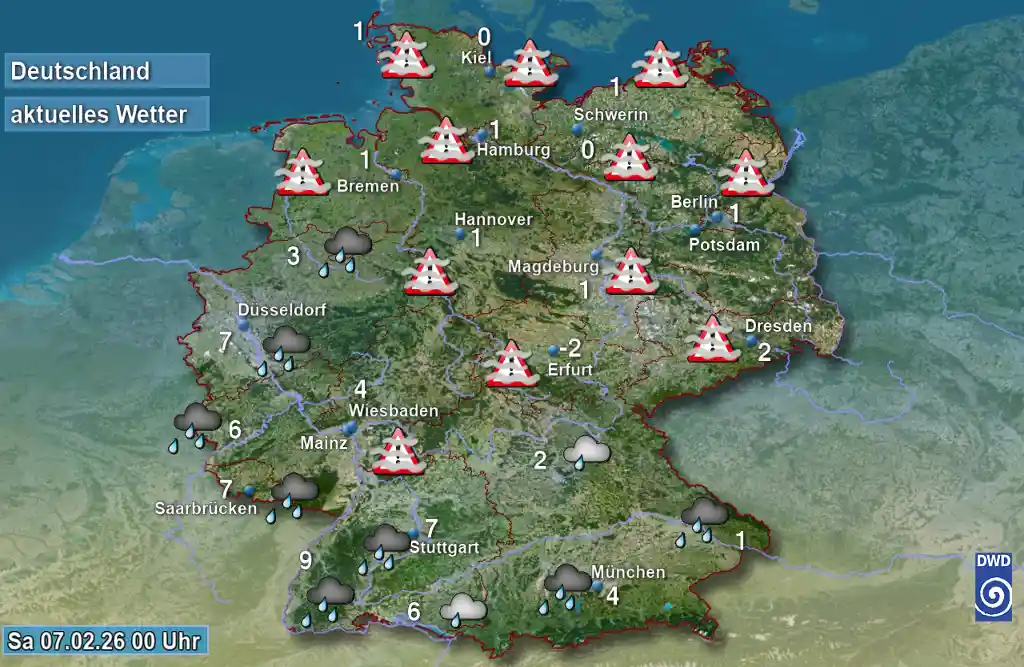In der Nacht von Südwesten bis zur Weser, im Nordosten, sowie nach Ostbayern leichter Niederschlag, teils gefrierender Regen. Erhöhte Glättegefahr. Verbreitet Nebel ++ Hier anklicken für mehr Infos ++